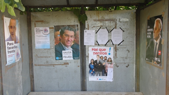 Como non podía ser doutra maneira comenzamos un novo mes con noticias e como podedes ver nas imaxes o ambente das eleccións pálpase no pueblo, hai carteles por todos os laos. Pra que digan que non hai cartos!!!. Estamos desexando que chegue o 21 de octubre para poder ir a expresar ou non o noso voto. Cousa que non se nos permitiu cando o alcalde puxo a dedo a un pedaneo que nin sequera vive na parroquia.